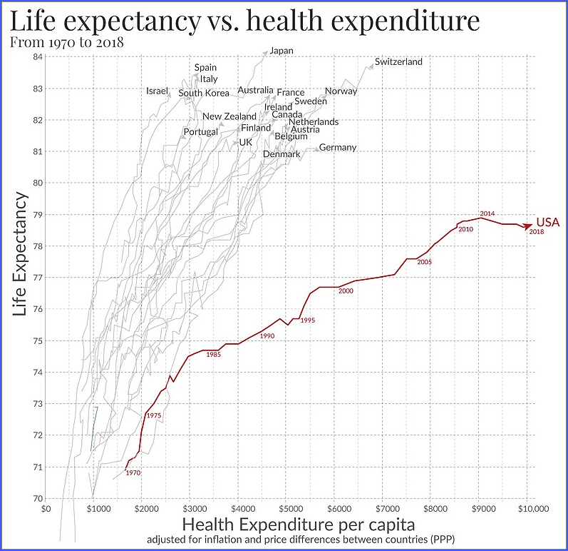 The urgency of the moment–the U.S.A. spends the most of any nation on earth on healthcare, but our longevity is pretty bad and getting worse every year.